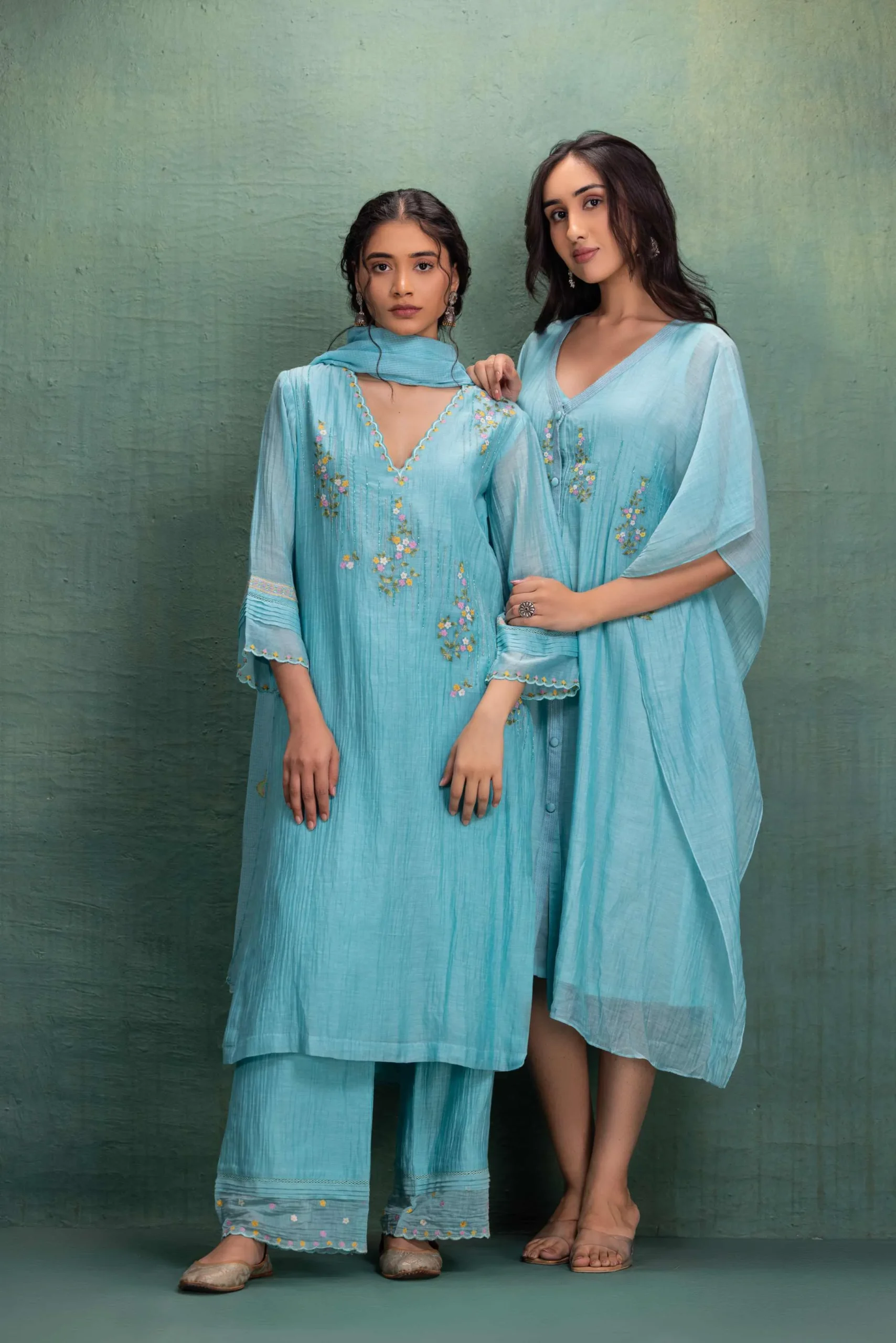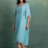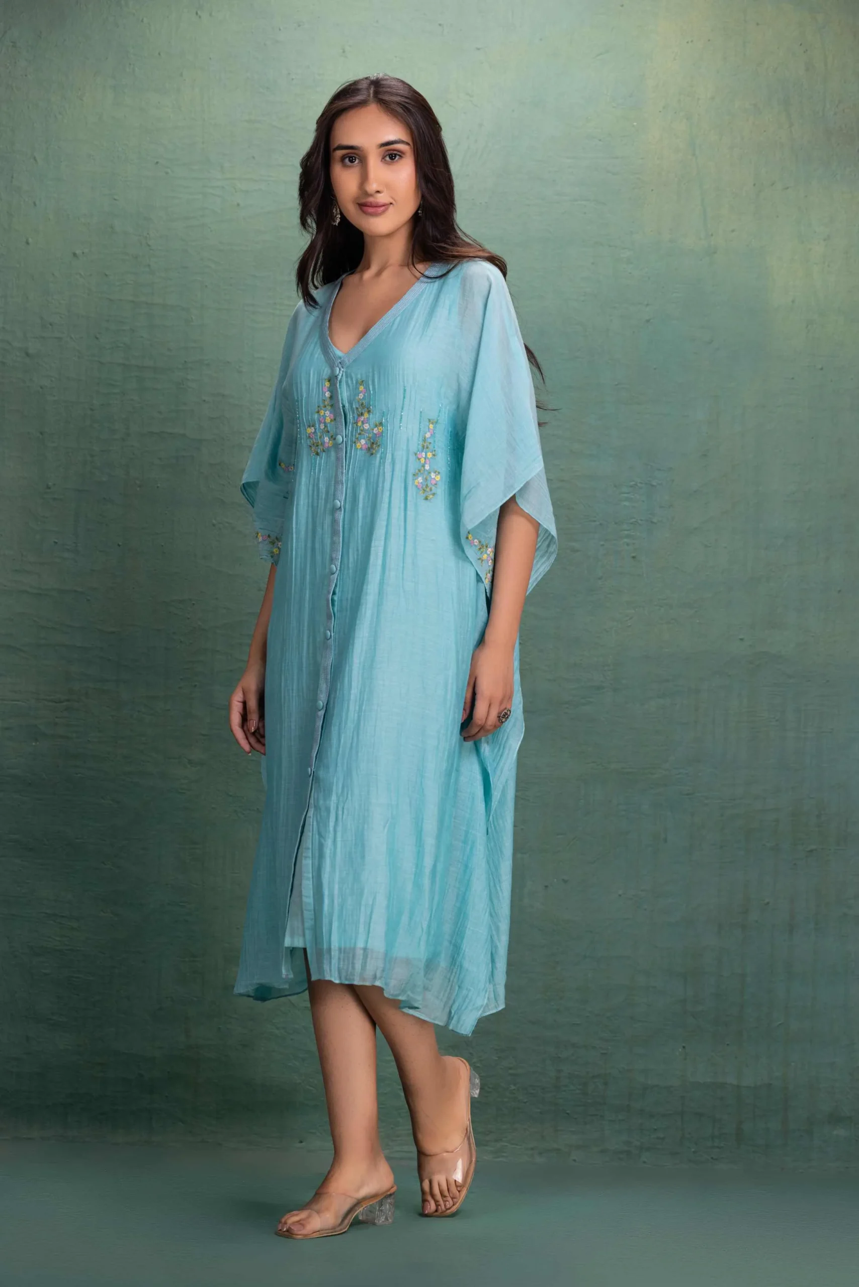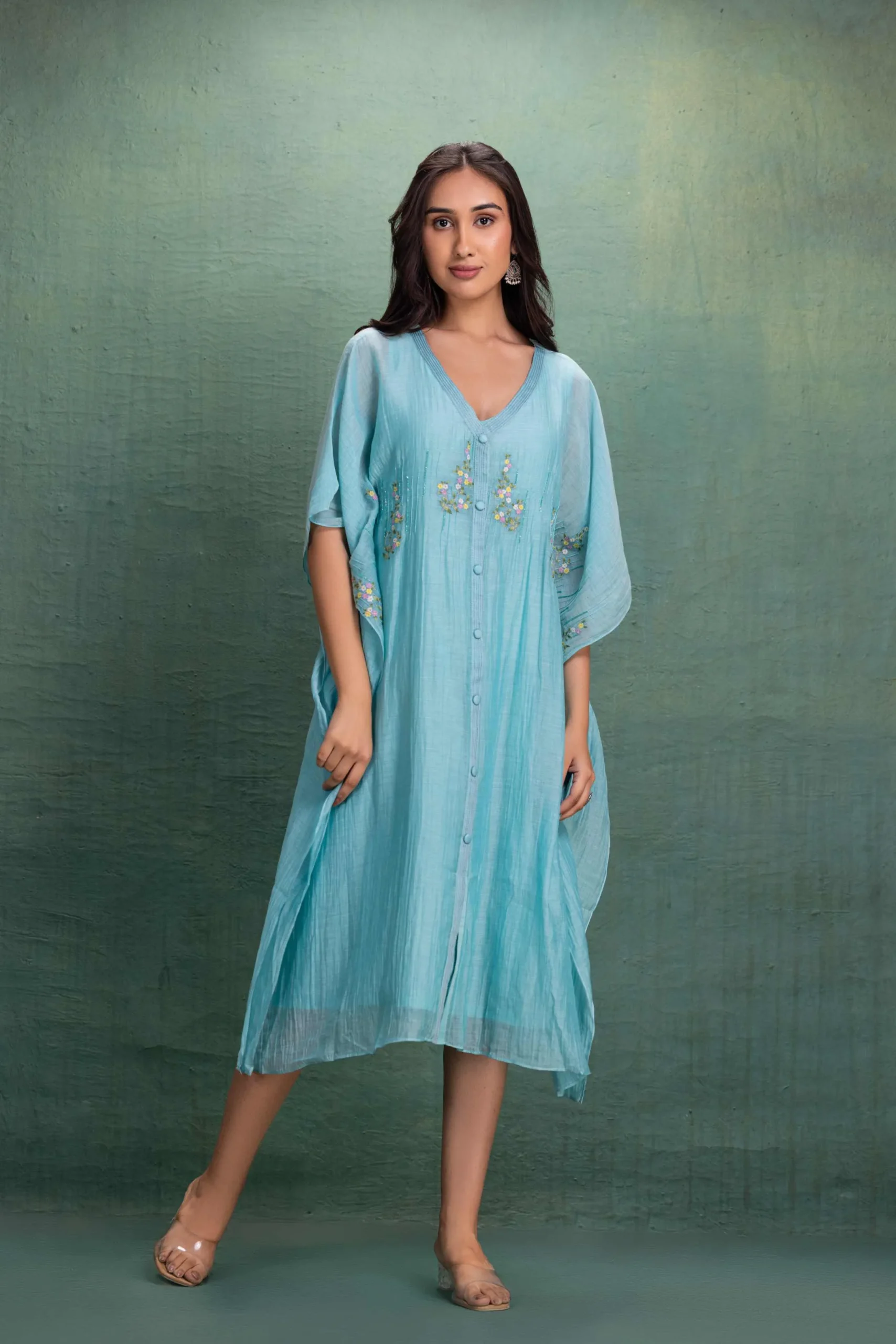 Step into effortless elegance with our Aqua Breeze Embroidered Kaftan Dress. Designed for modern comfort and timeless style, this flowy silhouette features delicate floral embroidery that adds a soft, feminine charm.