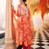 Vibrant, festive, and effortlessly graceful — the Coral Bloom Anarkali Set is designed to turn every moment into a celebration. Crafted in a rich coral hue adorned with intricate floral motifs, this ensemble radiates warmth, elegance, and festive charm.