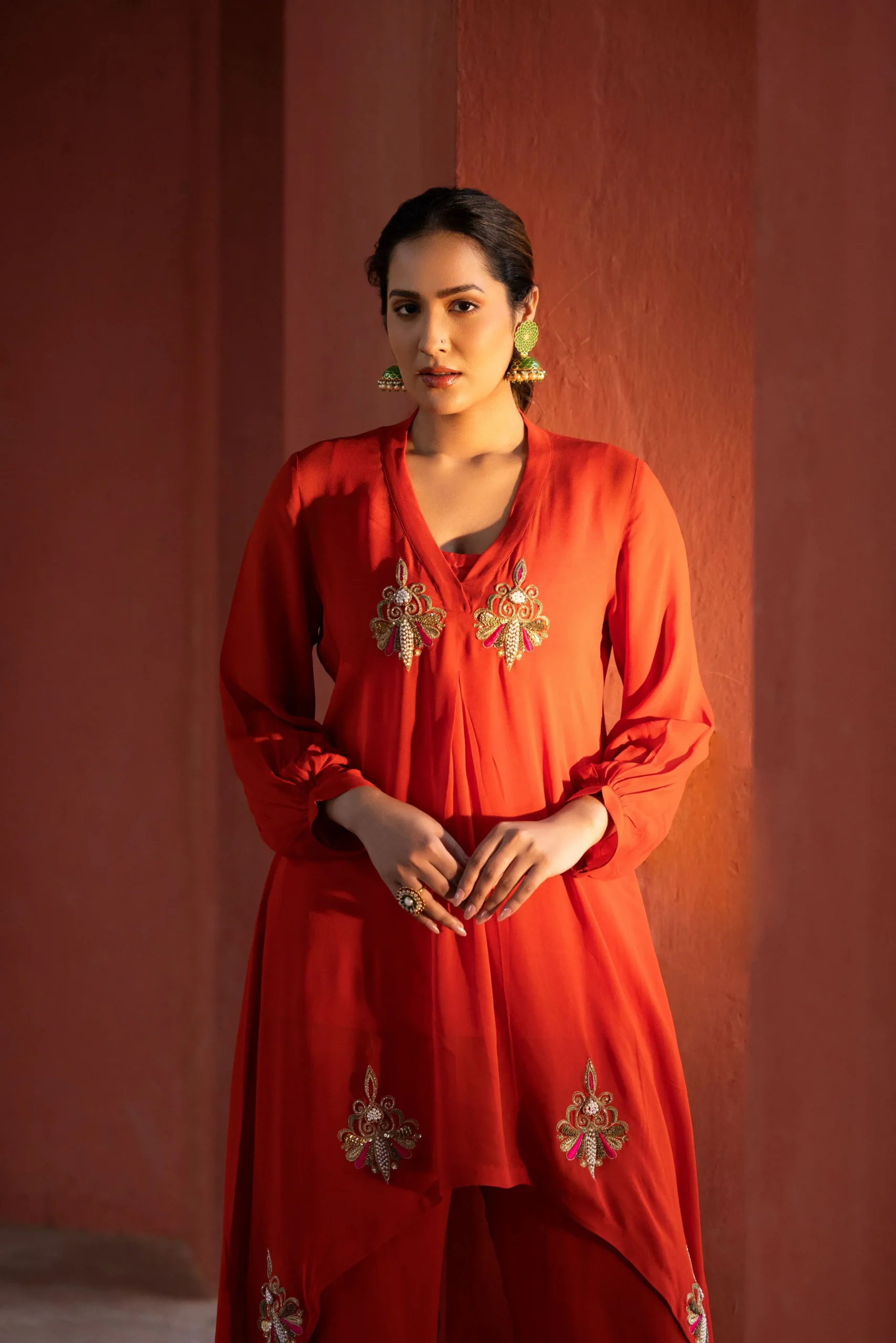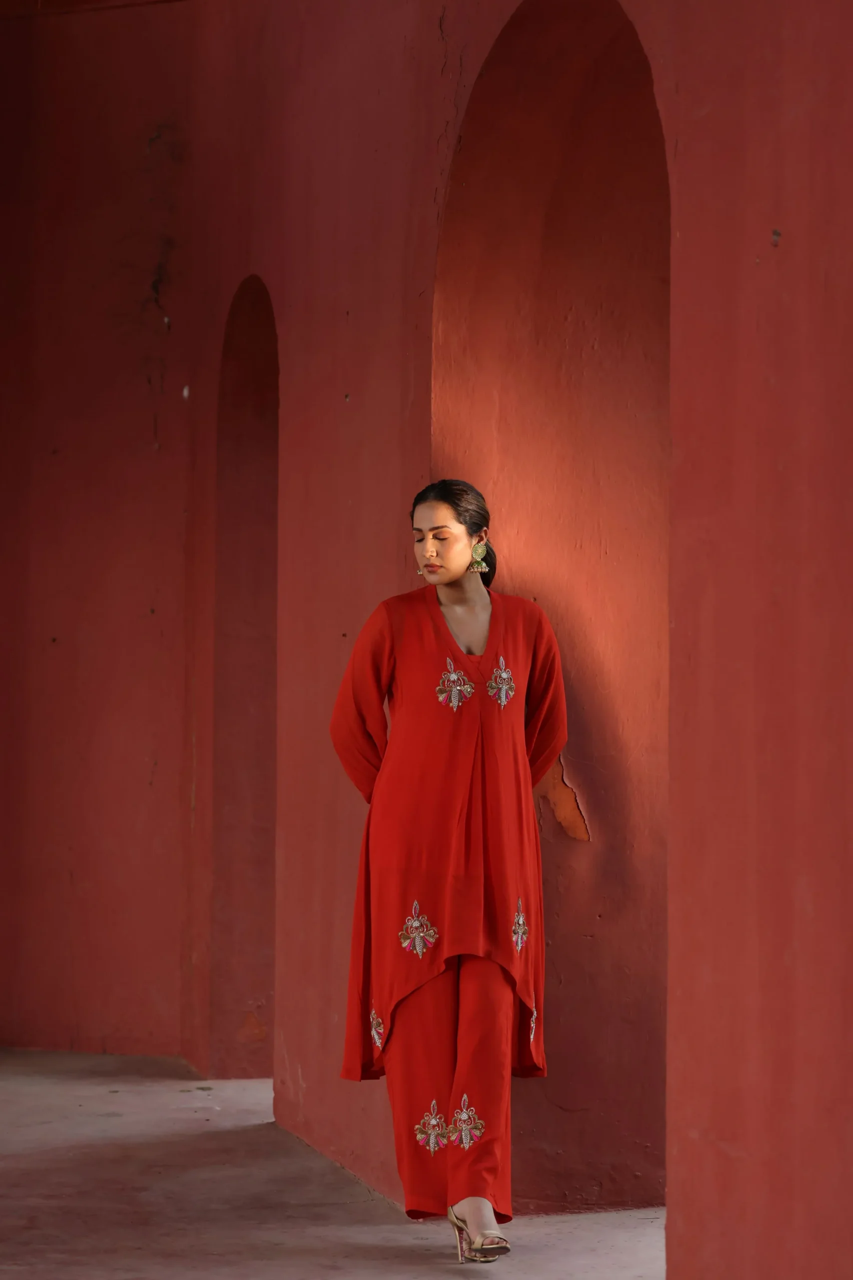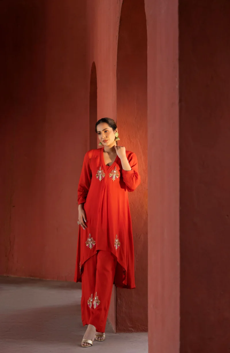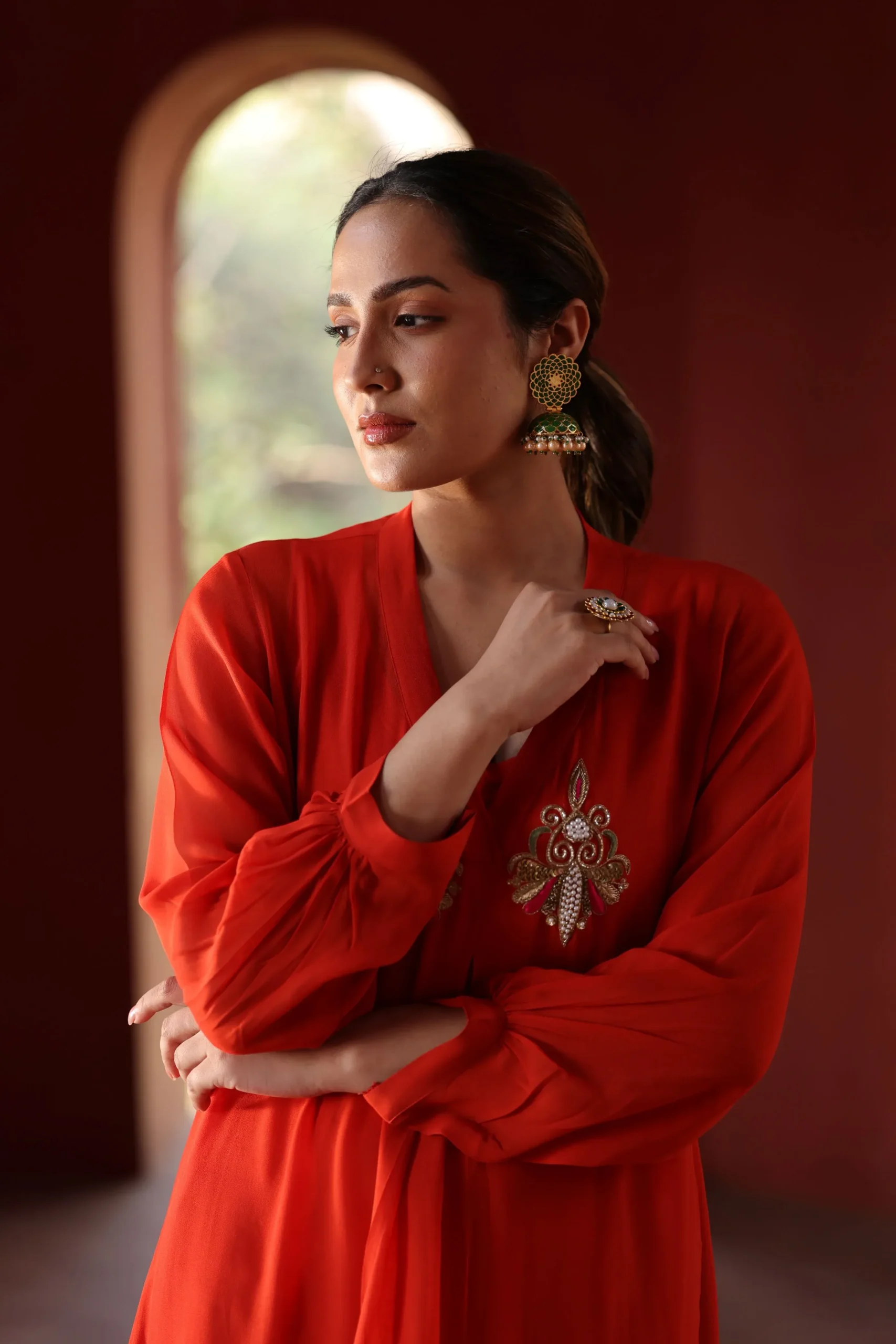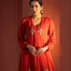Elevate your ethnic wardrobe with the timeless elegance of our Crimson Grace Embroidered Kurta Dress. Crafted in a rich, deep red hue, this piece exudes sophistication and understated luxury.