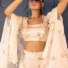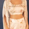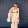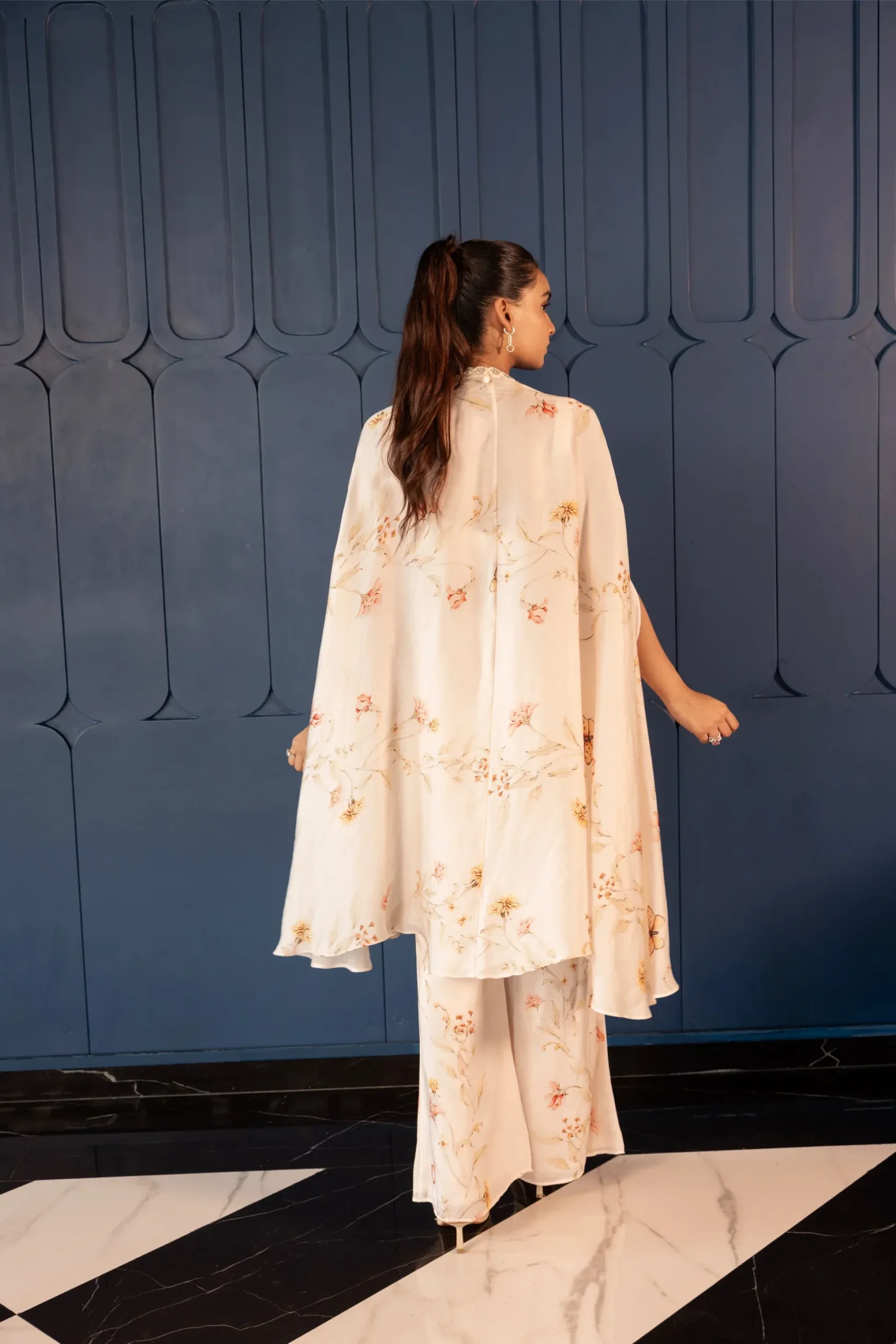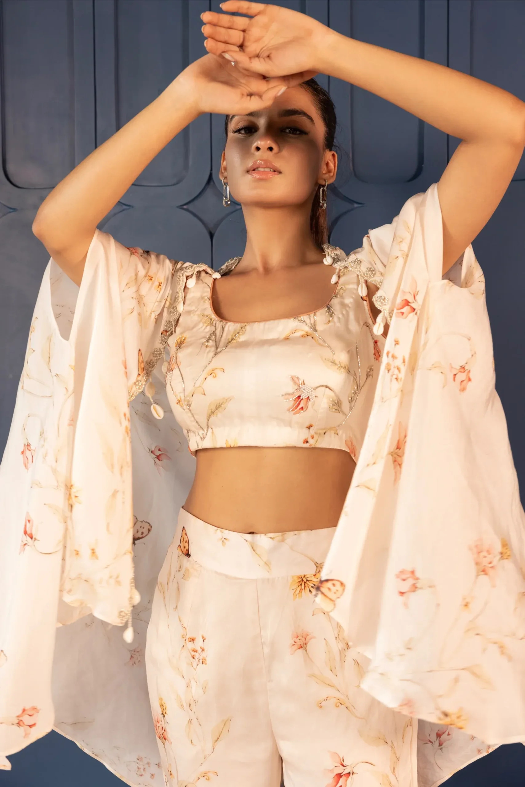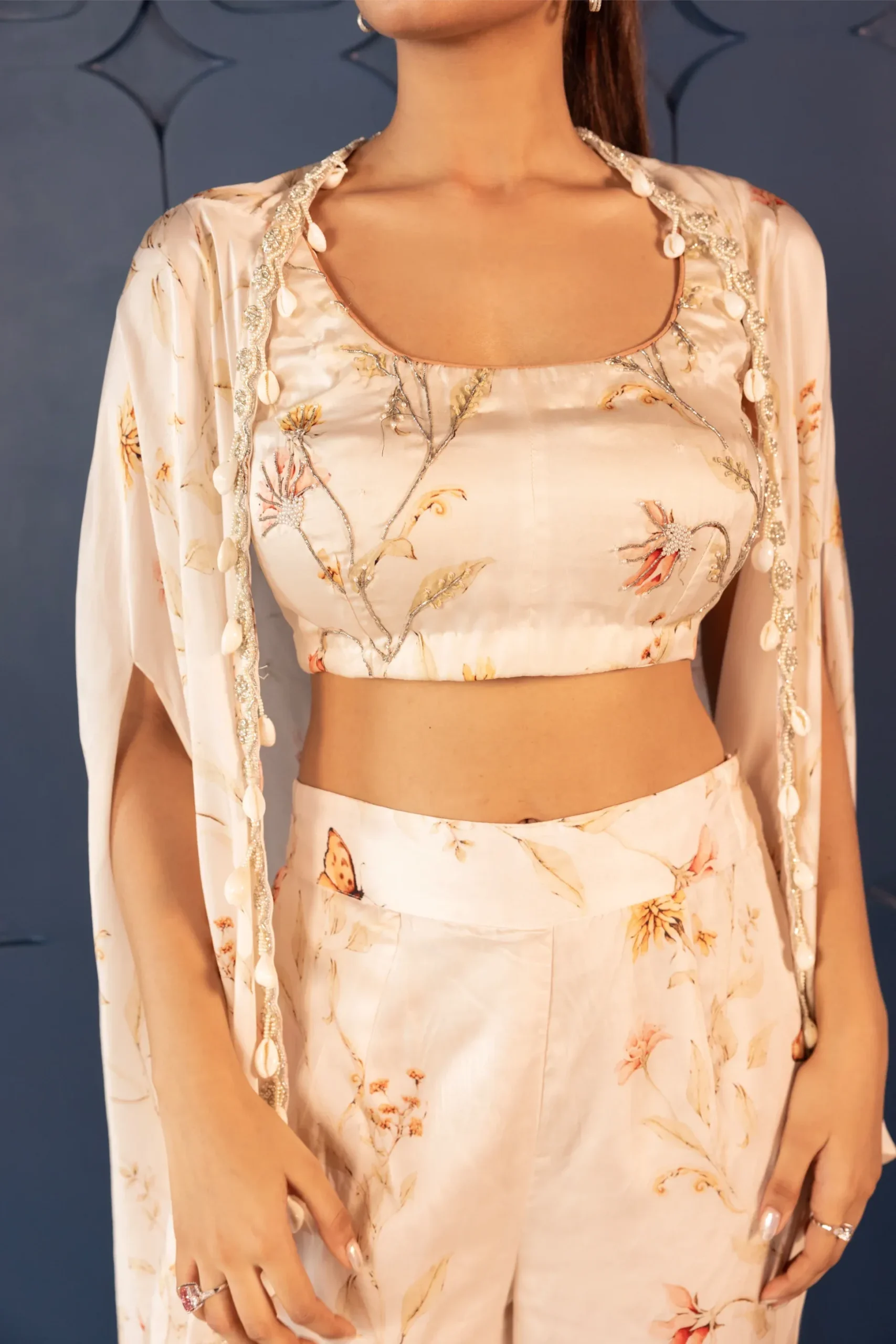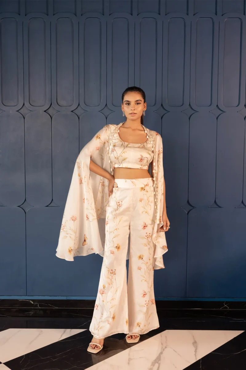 Soft, graceful, and effortlessly refined — the Ivory Floral Co-ord Set with Cape is a celebration of modern femininity. Designed in a delicate ivory base with subtle floral prints, this ensemble features a structured crop top paired with flowy wide-leg trousers for a relaxed yet polished silhouette.