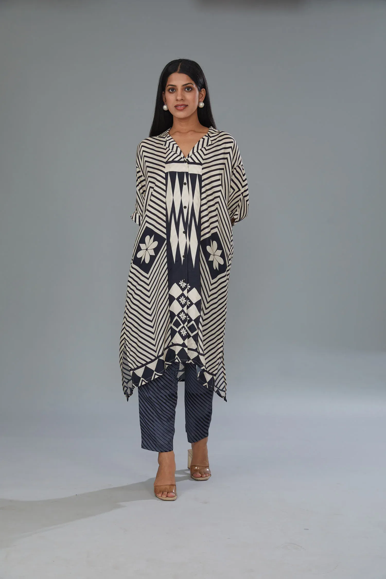 The flowy kurta with an asymmetrical hemline adds movement and elegance, while the coordinated straight-fit pants complete the outfit with effortless balance. Crafted from lightweight, breathable fabric, this set ensures comfort without compromising on style.