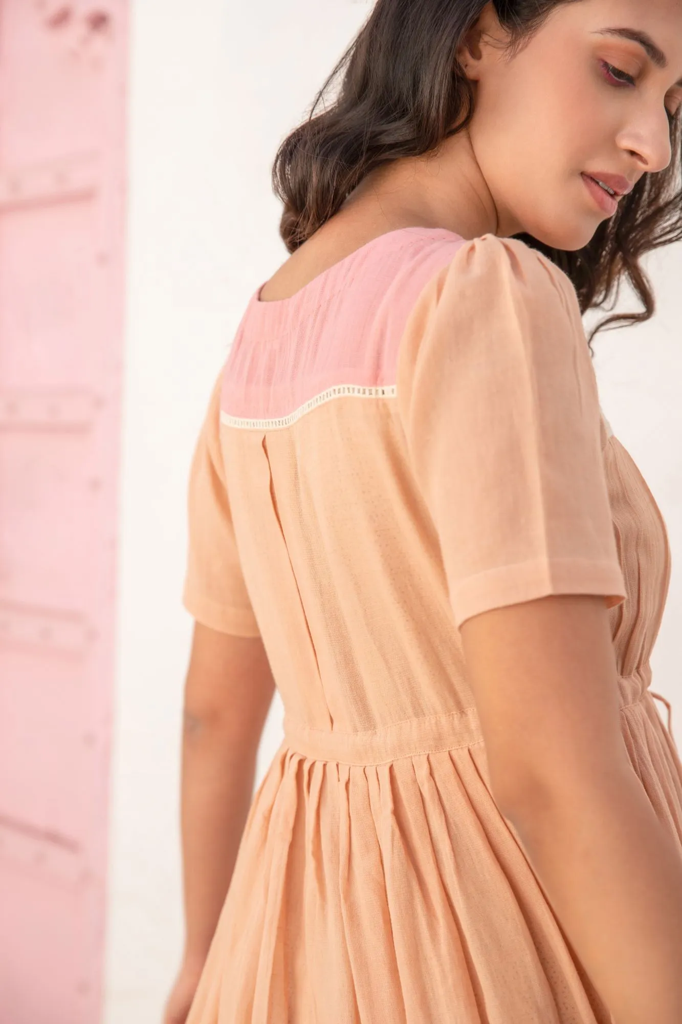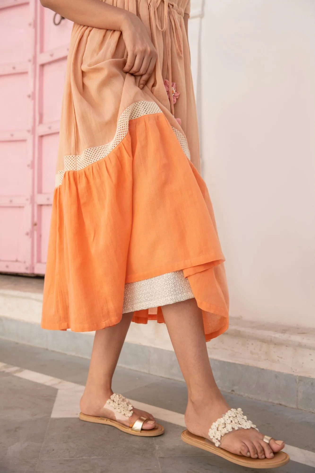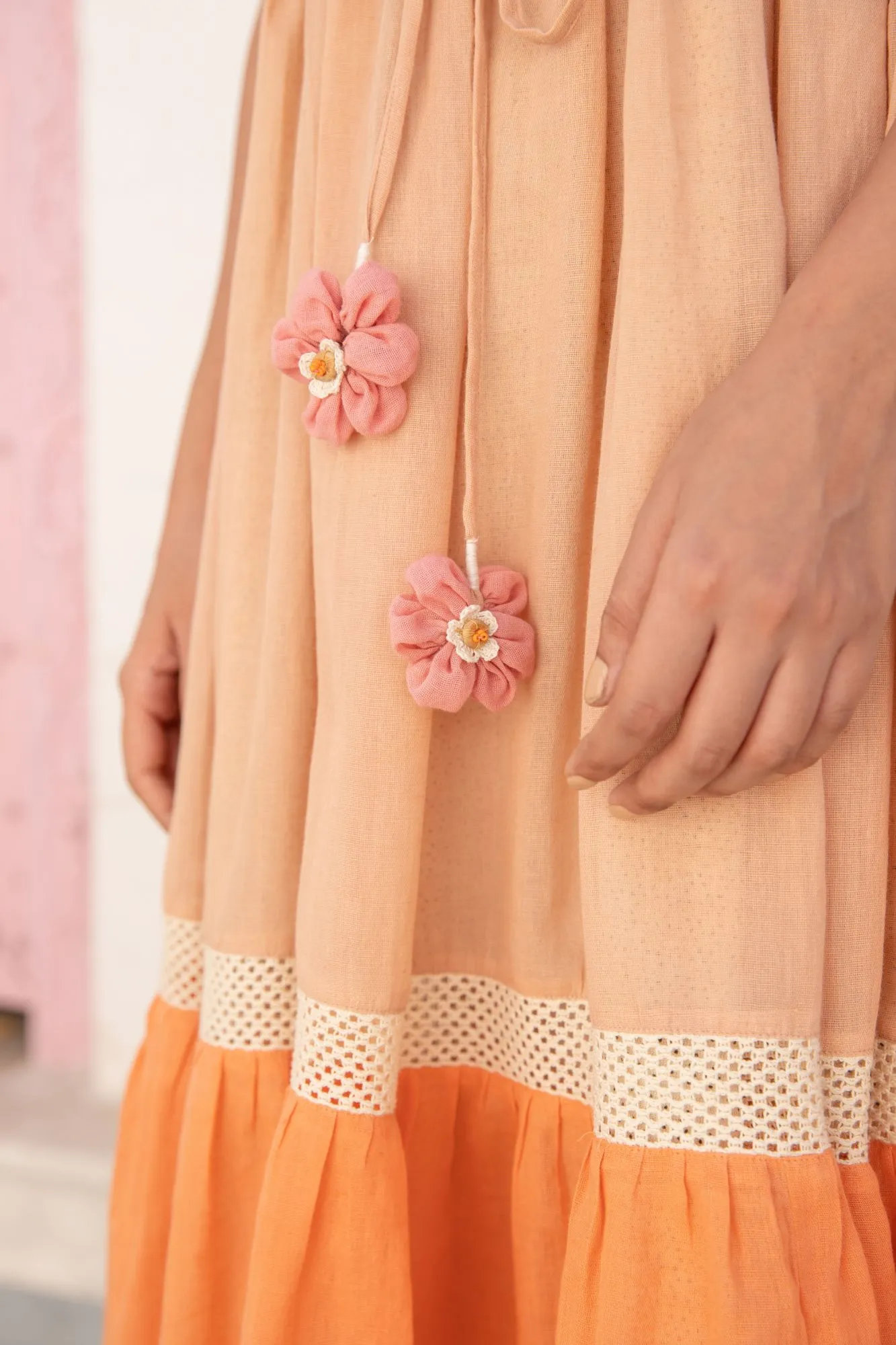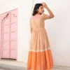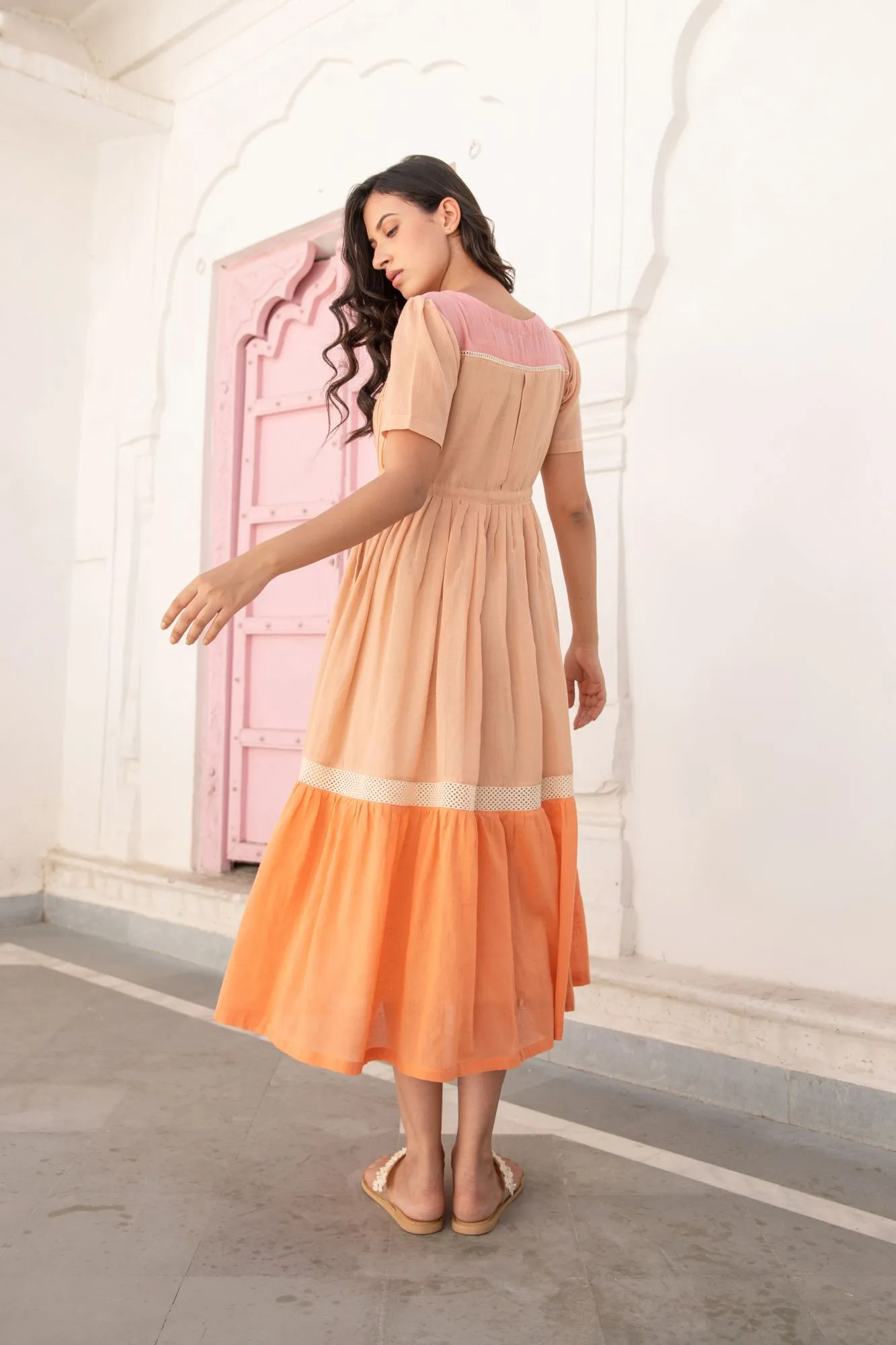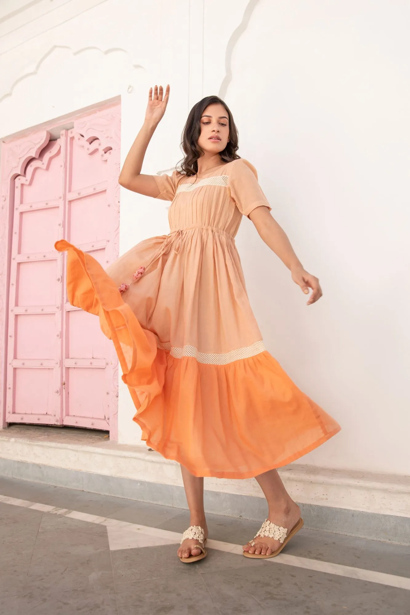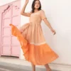 Radiating warmth and effortless charm, the Peach Glow Tiered Midi Dress is designed to bring a playful elegance to your everyday style. Crafted in soft peach tones with a vibrant orange contrast hem, this dress captures a beautiful gradient-inspired look.