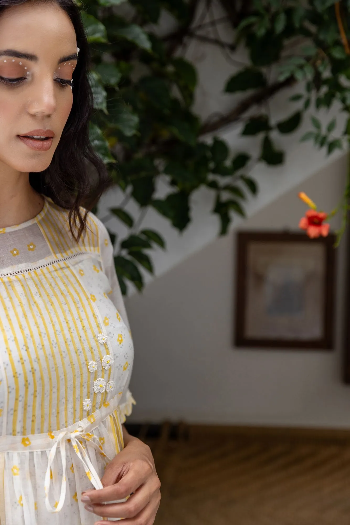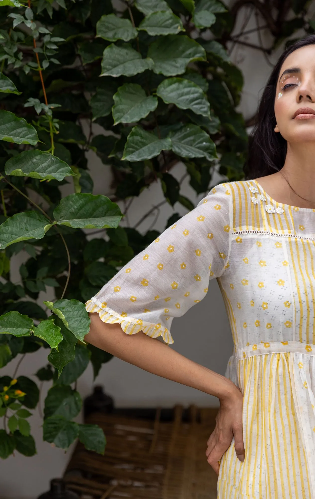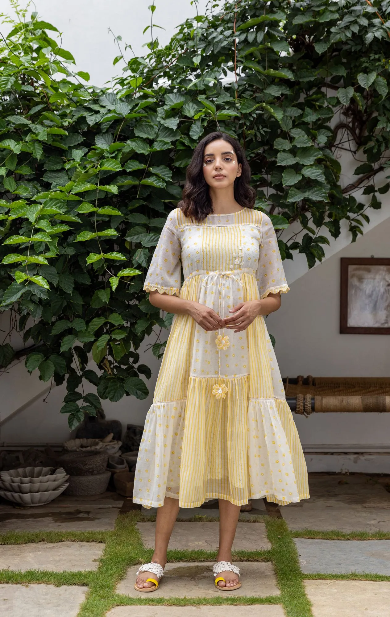 Brighten up your wardrobe with the Sunlit Meadow Tiered Midi Dress, designed to bring a fresh and cheerful vibe to your everyday style. Featuring a beautiful blend of soft yellow and ivory tones, this dress is adorned with subtle prints that enhance its light, feminine appeal.